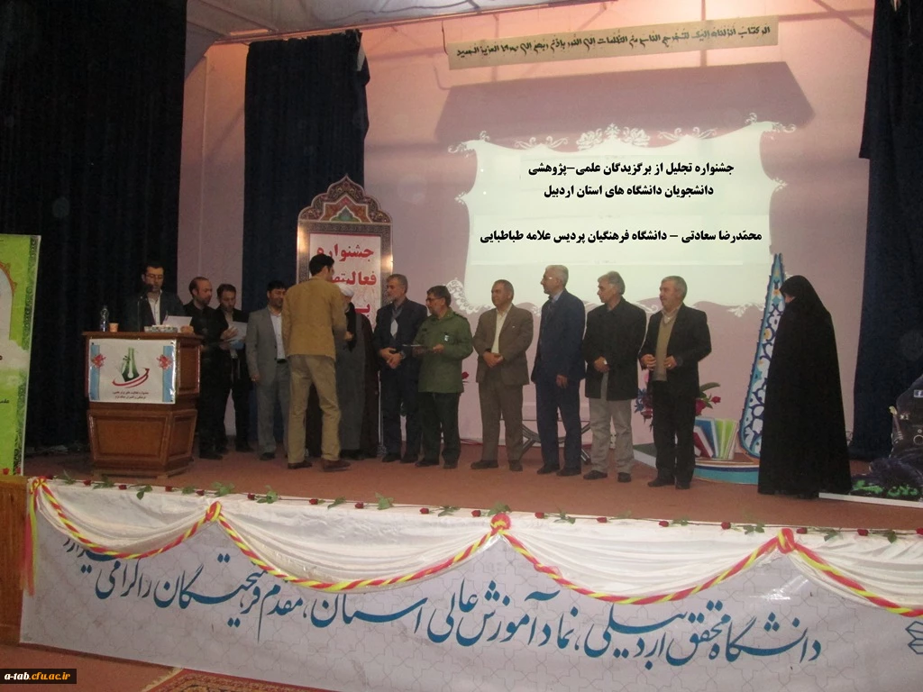 مراسم اختتامیه ی جشنواره ی فعّالیّت های برتر علمی، فرهنگی و افسران جنگ نرم دانشگاه های استان با افتخارآفرینی دانشجو معلمان دانشگاه فرهنگیان اردبیل برگزار شد. 6