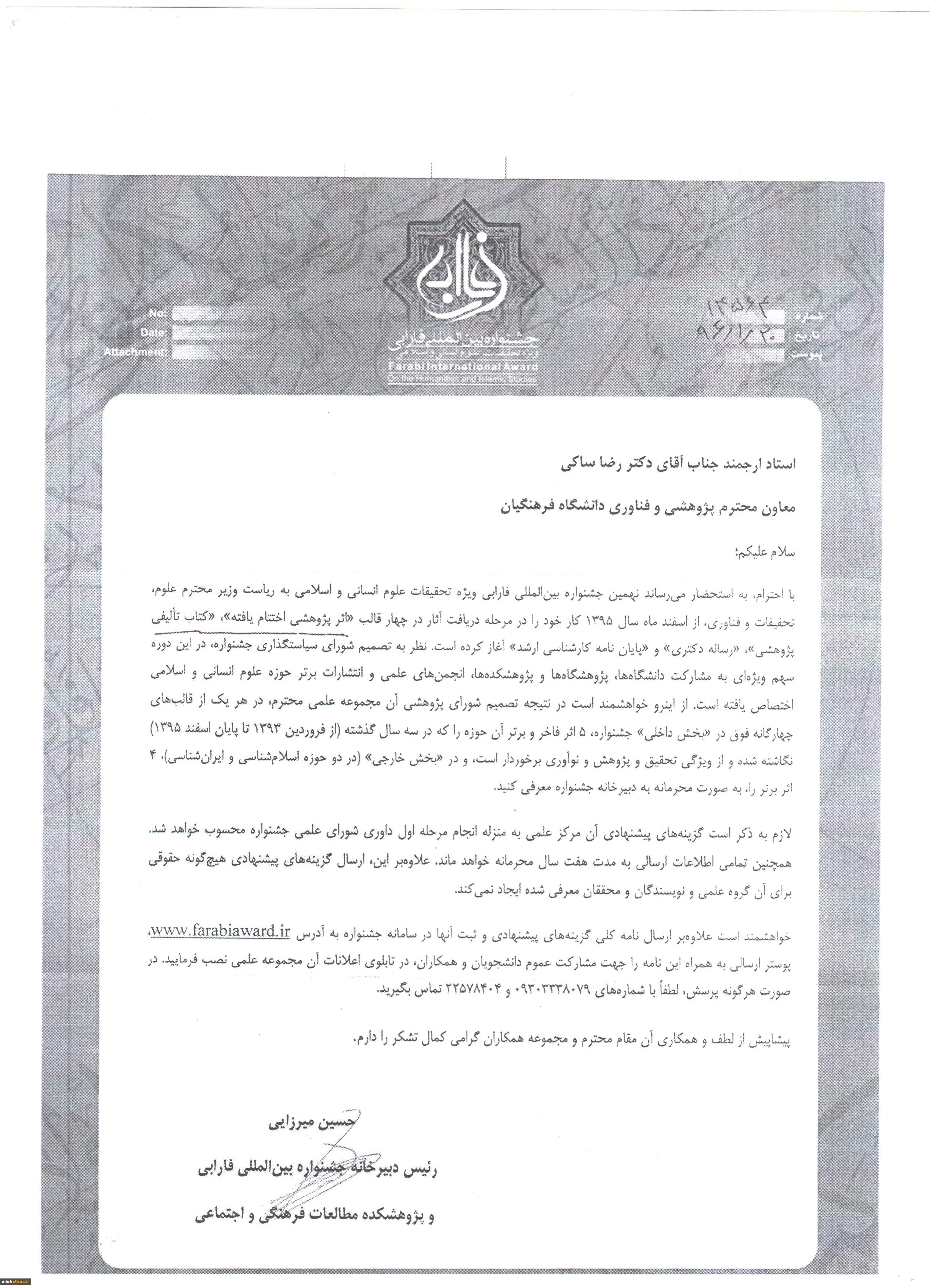 اطلاعیه جشنواره بین المللی فارابی با توجه به برگزاری نهمین جشنواره بین المللی فارابی ویژه ی تحقیقات علوم انسانی و اسلامی در خصوص معرفی آثار برتر و فاخر، نامه ی دبیرخانه ی جشنواره جهت استحضار علاقه مندان به شرکت در جشنواره پیوست می شود. 2