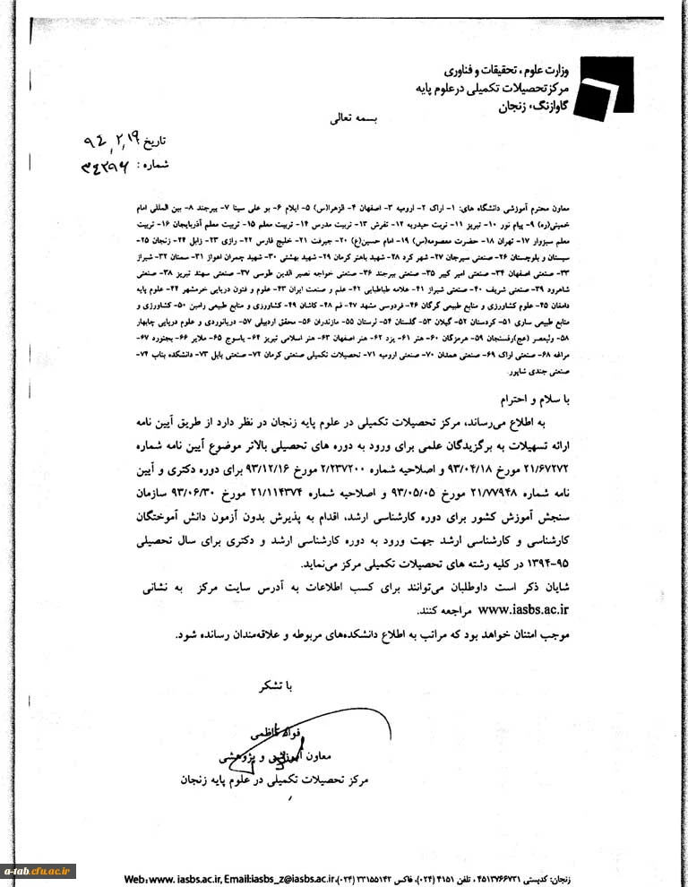اطلاعیه مرکز تحصیلات تکمیلی در علوم پایه زنجان مبنی بر پذیرش بدون آزمون در دوره کارشناسی ارشد و دکتری برای سال تحصیلی 95-1394 2